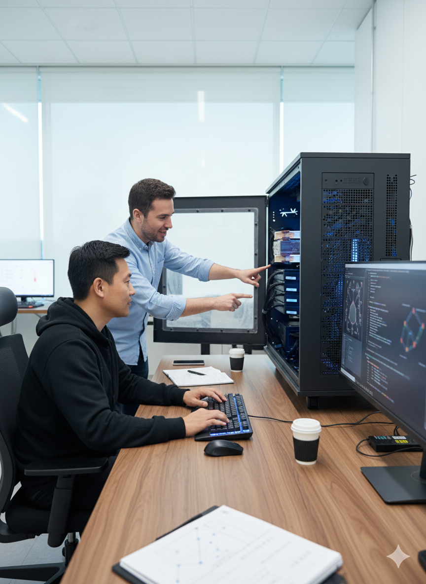 사진처럼 엔지니어가 현장에서 함께 세팅하고, 팀 업무 흐름에 맞춰 프로그램을 구성해 드립니다. 설치 후에는 바로 모델 실행·데이터 업로드·결과 확인까지 진행할 수 있어, 첫날부터 성과를 만들 수 있습니다.